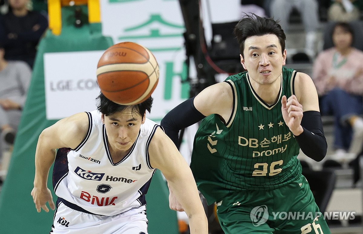 (원주=연합뉴스) 양지웅 기자 = 21일 강원 원주DB프로미아레나에서 열린 2025-2026 프로농구 원주 DB와 부산 KCC의 경기. DB 강상재와 KCC 송교창이 루즈볼을 향해 달려가고 있다. 2026.1.21 yangdoo@yna.co.kr