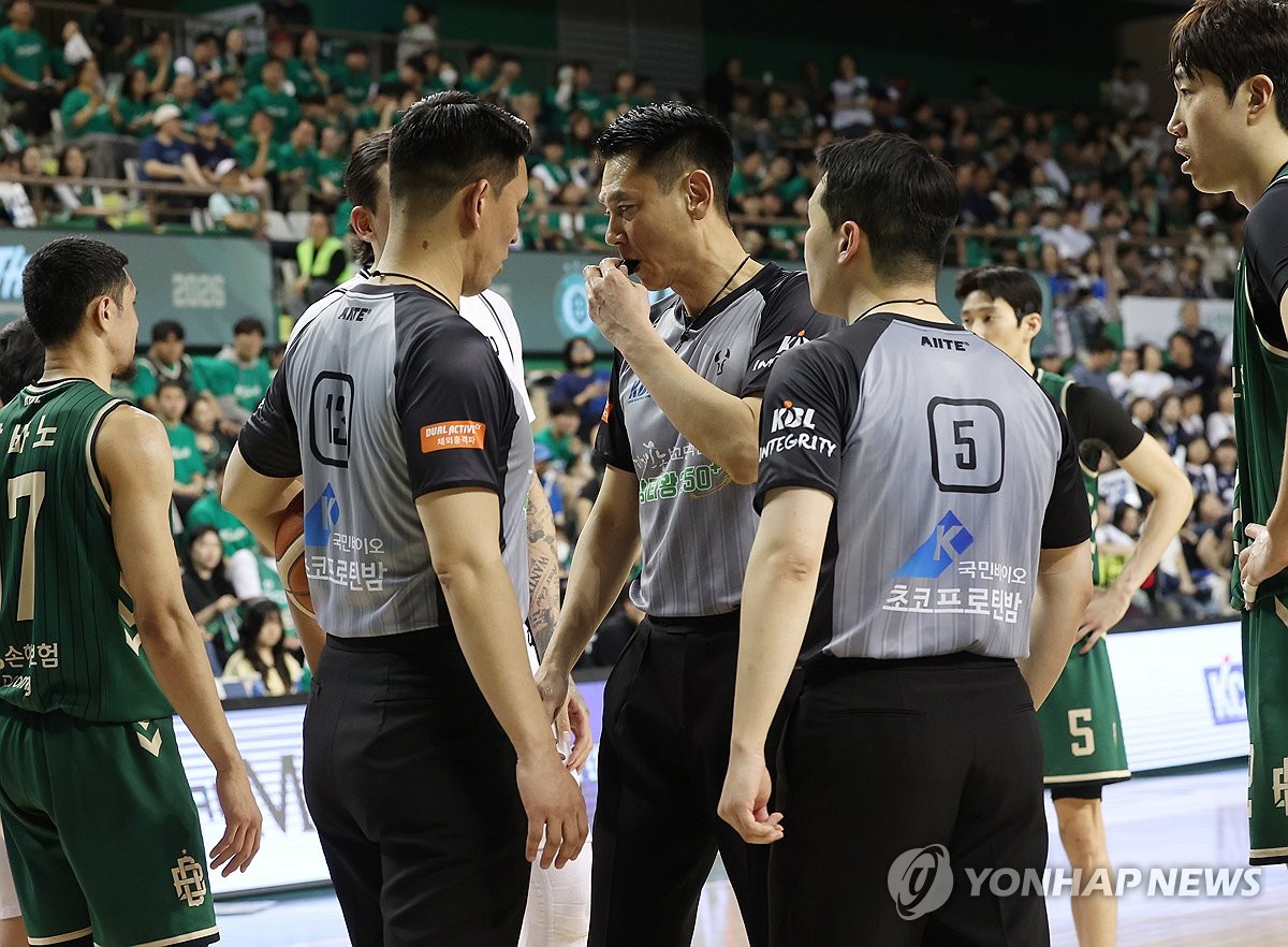 (원주=연합뉴스) 양지웅 기자 = 13일 강원 원주DB프로미아레나에서 열린 2025-2026 프로농구 원주 DB와 부산 KCC의 6강 플레이오프 1차전 경기. DB 헨리 엘런슨의 다섯번째 파울 여부를 두고 심판들이 의논하고 있다. 2026.4.13 yangdoo@yna.co.kr