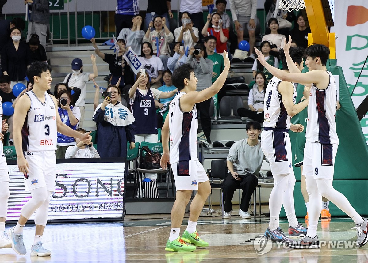 (원주=연합뉴스) 양지웅 기자 = 13일 강원 원주DB프로미아레나에서 열린 2025-2026 프로농구 원주 DB와 부산 KCC의 6강 플레이오프 1차전 경기. KCC 선수들이 승리를 확정한 뒤 기뻐하고 있다. 2026.4.13 yangdoo@yna.co.kr