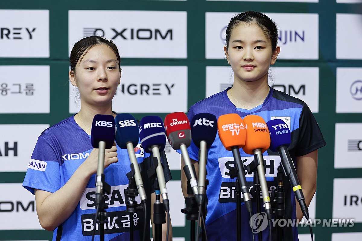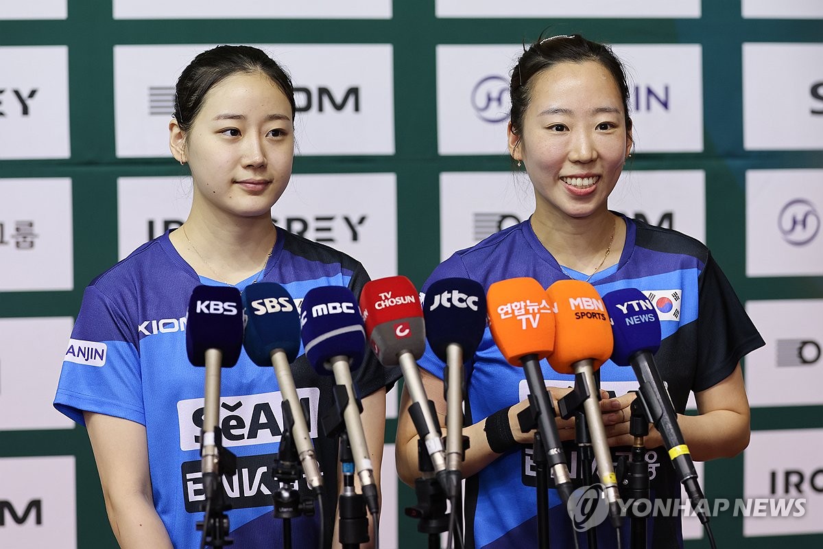 (진천=연합뉴스) 서대연 기자 = 23일 충청북도 진천군 진천선수촌에서 열린 2026 런던 세계탁구 단체전선수권대회 미디어데이 행사에서 탁구 대표팀 박가현(왼쪽)과 김나영이 인터뷰를 하고 있다. 2026.4.23 dwise@yna.co.kr