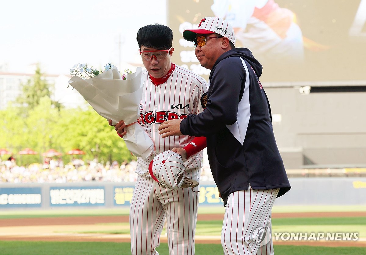 (광주=연합뉴스) 조남수 기자 = 25일 광주기아챔피언스필드에서 열린 프로야구 롯데 자이언츠와 KIA 타이거즈의 경기. KBO 최초로 2,200탈삼진을 달성한 KIA 양현종이 이범호 감독으로부터 꽃다발을 받고 있다. 2026.4.25 iso64@yna.co.kr