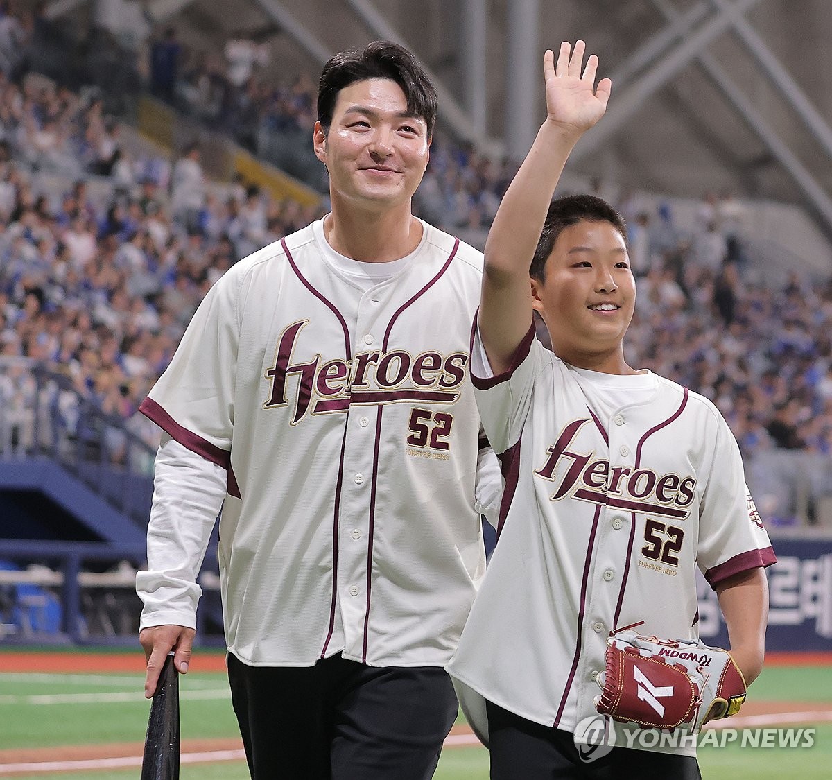(서울=연합뉴스) 류영석 기자 = 은퇴식을 치른 박병호 키움 히어로즈 코치가 26일 서울 고척스카이돔에서 열린 KBO 프로야구 삼성 라이온즈와 키움 히어로즈의 경기에서 가족과 시구,시타를 마친 뒤 퇴장하고 있다. 2026.4.26 ondol@yna.co.kr