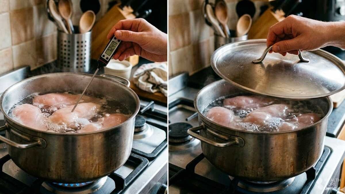 온도를 조절한 뒤에는 냄비 뚜껑을 닫고 약 10분에서 20분 정도 기다린다. 고기의 두께에 따라 시간은 달라질 수 있지만, 가장 중요한 기준은 고기 내부의 온도다. 고기 중심부가 71도 정도가 되었을 때가 가장 안전하면서도 맛이 좋은 상태다. 온도계가 없다면 가장 두꺼운 가운데 부분을 칼로 살짝 갈라보았을 때 붉은 기가 전혀 없고 속까지 하얀색으로 변했는지 확인하면 된다.