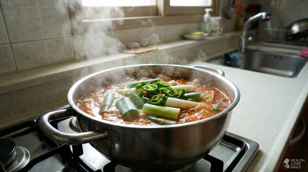 소주를 넣는 목적은 단순히 냄새를 없애기 위한 것이 아니다. 끓는 과정에서 생선 특유의 불쾌한 냄새 성분을 날리는 동시에, 국물의 밸런스를 잡아준다. 찌개의 향이 겹치지 않도록 정리해주는 역할을 한다.