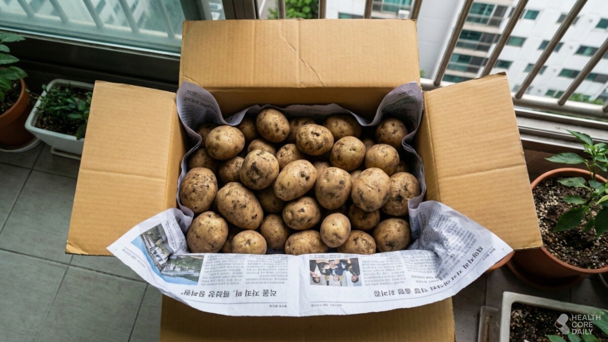 보관 장소도 중요하다. 햇빛을 받으면 감자 껍질이 초록빛으로 변하면서 독성이 생긴다. 따라서 빛이 들지 않는 곳에 두는 것이 기본이다. 상자 위에 신문지를 한 겹 덮어 직사광선을 차단하고, 베란다 구석처럼 서늘하고 그늘진 곳에 두면 적당하다.