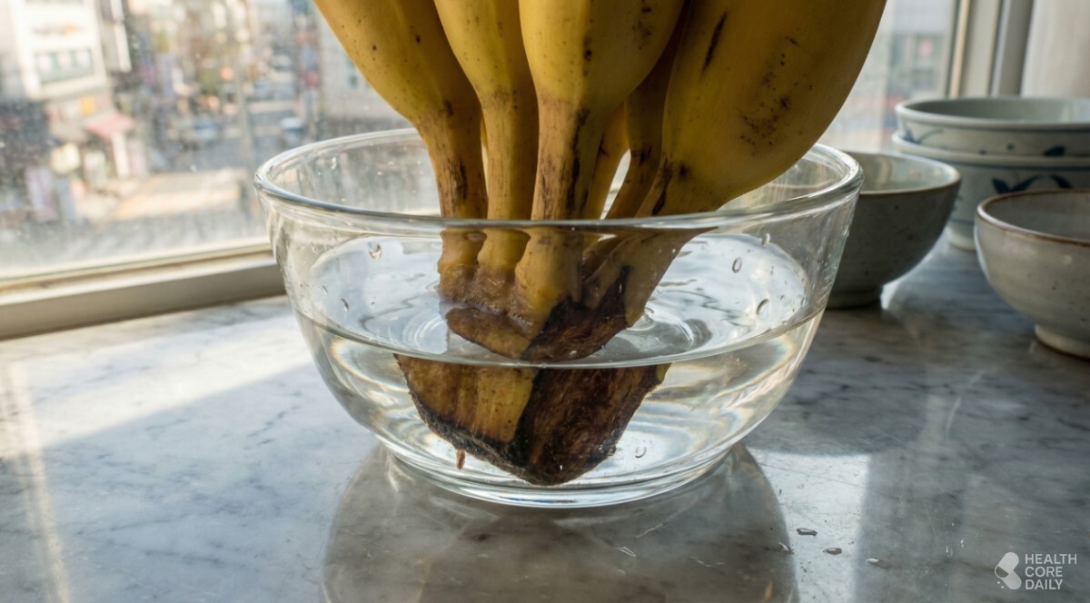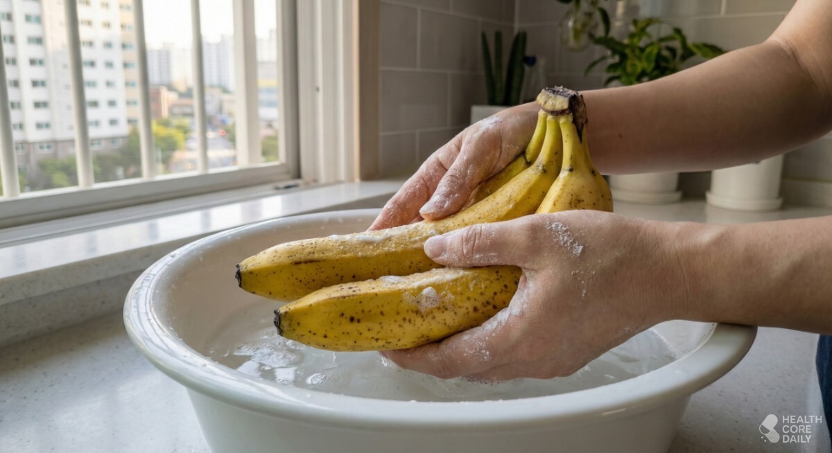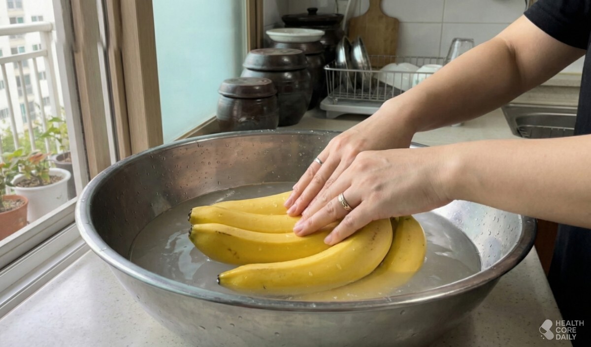 방법은 간단하다. 물 한 그릇에 소금 두 티스푼을 풀어 바나나를 부드럽게 문질러 닦고, 줄기 부분은 따로 1~2분 정도 담가두면 된다. 줄기에서 퍼져 나오는 숙성 성분을 초기에 제거하면, 갈변이 늦춰진다. 또한 물로 헹군 후에는 반드시 물기를 제거해야 한다.