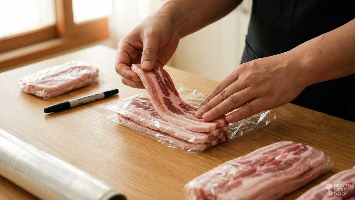 삼겹살은 먹고 남기 쉬운 만큼 보관법이 중요하다. 한 덩어리로 얼리면 해동이 불편하고 고기 맛도 떨어진다. 삼겹살은 한 장씩 비닐 위에 올리고, 그 위에 다시 비닐을 덮은 뒤 다음 고기를 얹는 식으로 포장한다. 이런 방식으로 필요한 만큼 쌓은 다음, 전체를 랩으로 단단히 감싸 공기와의 접촉을 막는다. 보관 전에는 고기 부위와 날짜를 겉면에 적어두면 꺼낼 때 구분이 쉽고, 먹을 만큼만 꺼내기에도 편하다.