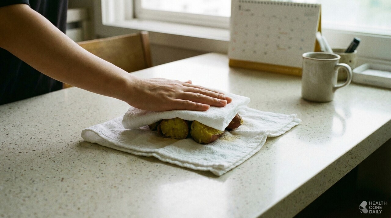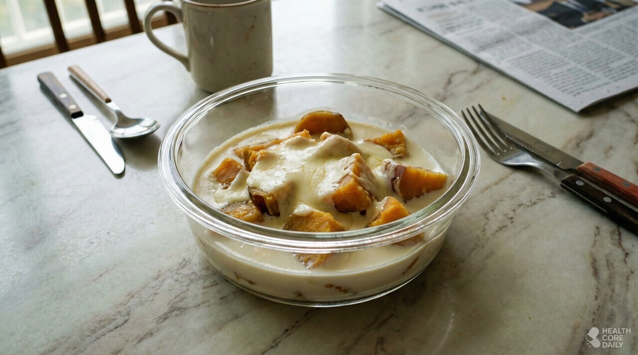 고구마를 찬물에 담그는 이유는 전분 때문이다. 전분기를 빼지 않으면 식감이 텁텁해진다. 30분 정도 담가두면 물이 뿌옇게 변한다. 이게 전분이 빠져나온 증거다. 물기를 제거할 때는 키친타월로 꼼꼼히 닦아야 한다. 수분이 남아 있으면 우유가 묽어진다.