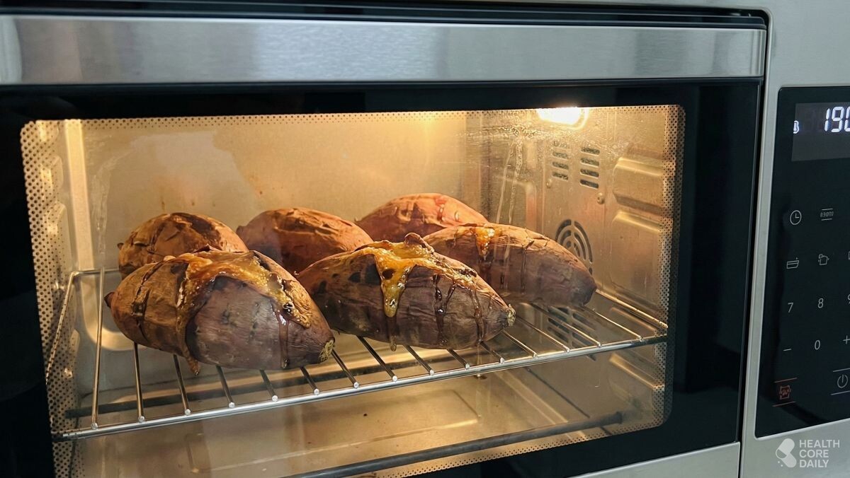이제 오븐이나 에어프라이어를 190도로 예열한다. 고구마는 서로 닿지 않게 간격을 두고 놓는다. 겹치면 열이 한쪽에 몰려 익는 정도가 달라질 수 있다. 먼저, 20분간 1차로 굽는다. 중간에 한 번 뒤집어 표면이 고르게 열을 받도록 한다.