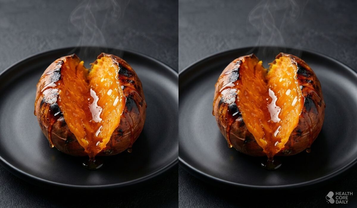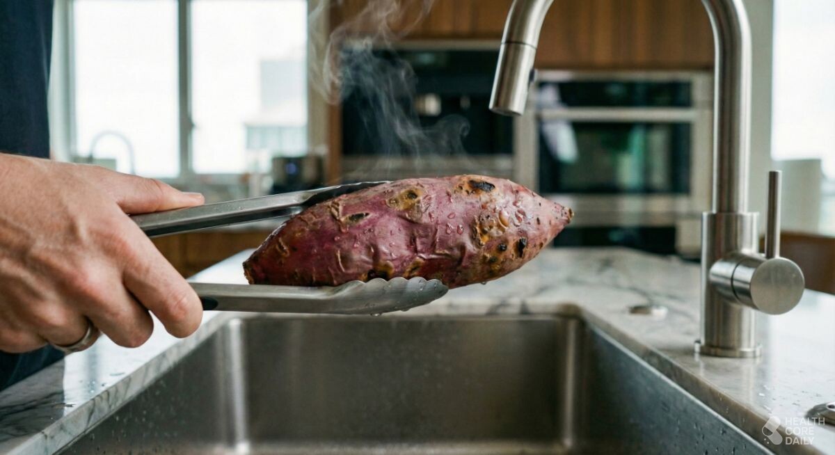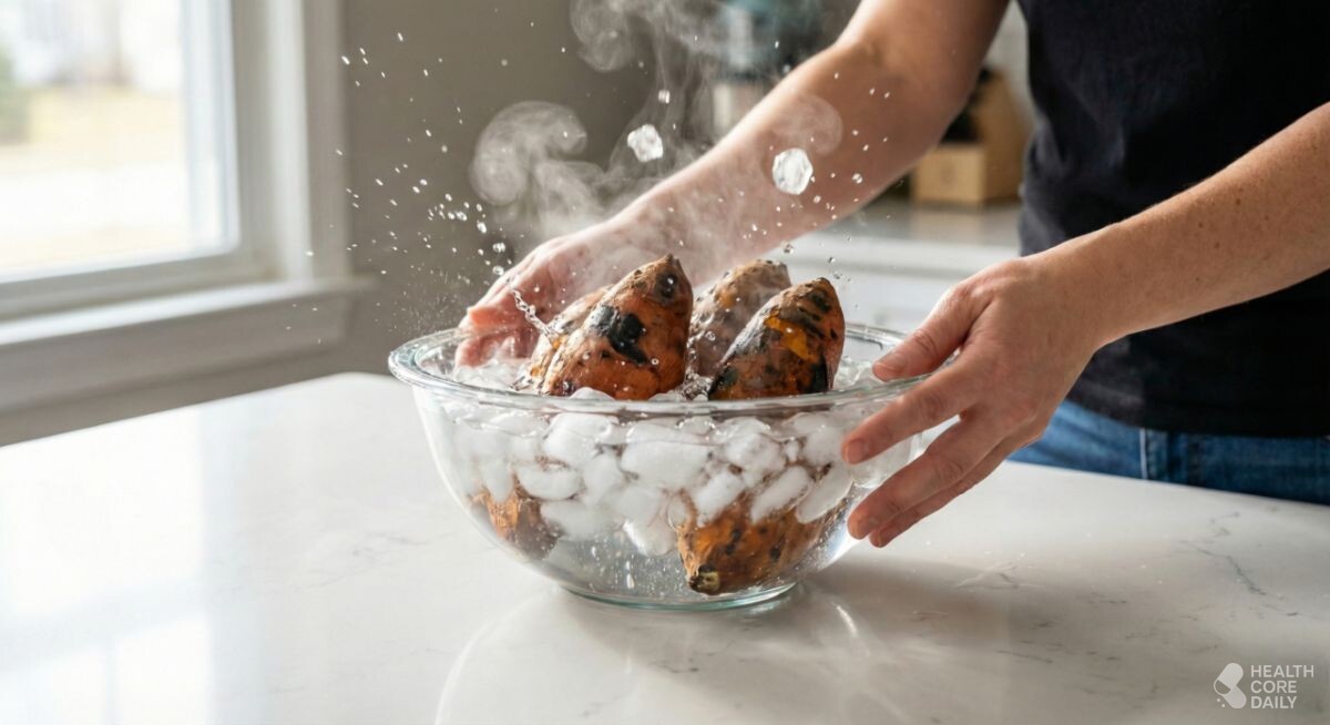 고구마는 수분과 전분 비율이 높은 뿌리채소다. 가열이 길어질수록 수분이 빠져나가고, 전분이 굳으면서 식감이 거칠어진다. 반대로 내부 수분을 붙잡은 채 천천히 익히면, 속은 부드럽고 겉은 쫀득하게 마무리된다. 군고구마를 꿀처럼 촉촉한 고구마로 바꾸는 데는 얼음물 하나면 충분하다.