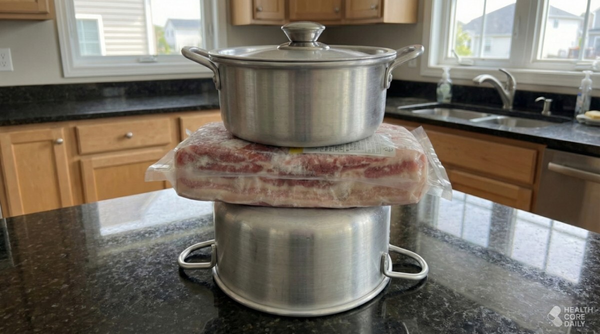 설탕물을 준비하기 번거롭다면, 냄비를 활용하는 방법도 있다. 알루미늄 냄비 하나를 뒤집어 바닥에 두고 그 위에 냉동 삼겹살을 올린 다음, 또 다른 냄비를 위에 덮는다. 금속은 열을 빠르게 전달하는 성질이 있어 실온에 그냥 두는 것보다 훨씬 빠르게 녹는다.