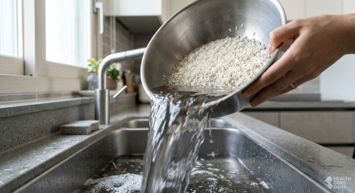 이때 중요한 점은 시간을 오래 끌지 않는 것이다. 쌀을 넣은 뒤 5초에서 10초 정도 가볍게 저어주고 바로 첫 물을 따라낸다. 첫 물에는 가장 많은 이물질이 섞여 있다. 이 상태로 오래 두면, 쌀이 탁한 물을 다시 흡수해 밥에서 군내가 날 수 있다. 물을 받아 둔 상태에서 쌀을 넣고, 짧게 흔들어 바로 버리는 것이 깔끔하다.