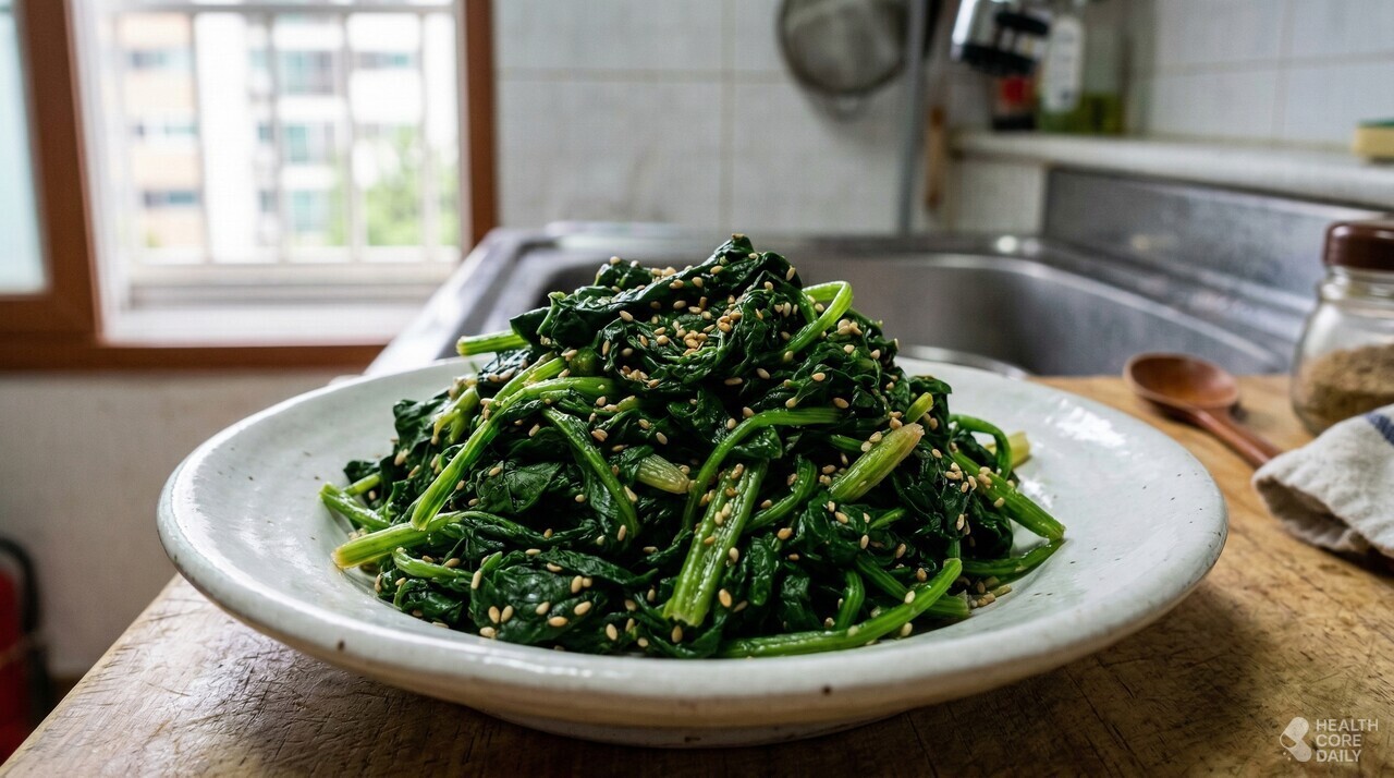 짙은 녹색 잎채소에는 비타민 A, C, E, K가 풍부하다. 이런 영양소는 세포 손상을 줄이고 염증 반응을 완화하는 데 도움을 준다.