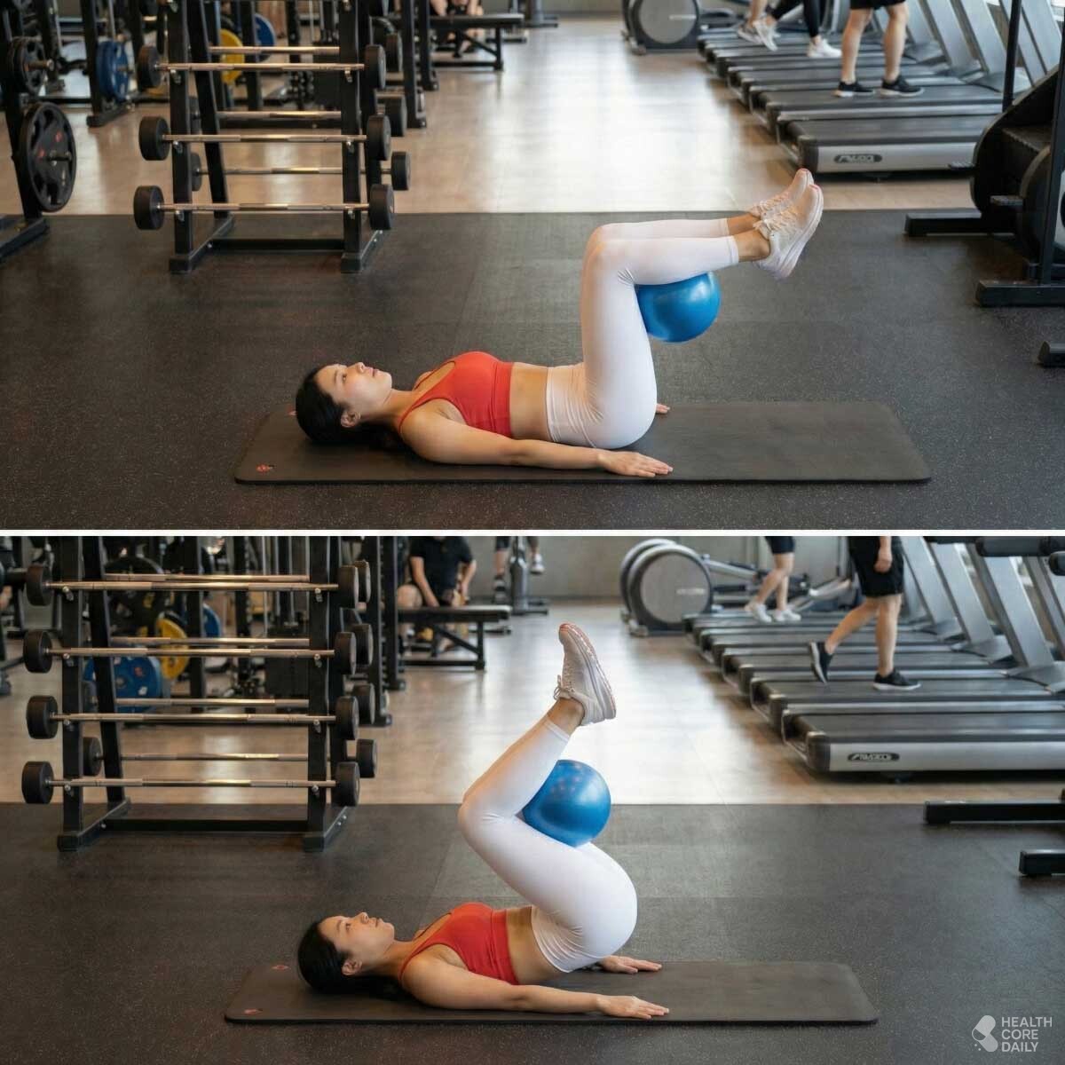 바닥에 등을 대고 눕는다. 팔은 몸통 옆 바닥에 두고 손바닥으로 바닥을 가볍게 누른다. 무릎은 90도 정도로 구부린 상태에서 두 다리를 들어 올리고, 허벅지 사이에 미니 볼이나 쿠션, 말아 놓은 수건을 끼운다. 이때 허리는 바닥에 자연스럽게 닿아 있고, 허리 아래 공간이 과하게 뜨지 않도록 배꼽을 안쪽으로 살짝 끌어당긴 느낌을 만든다.