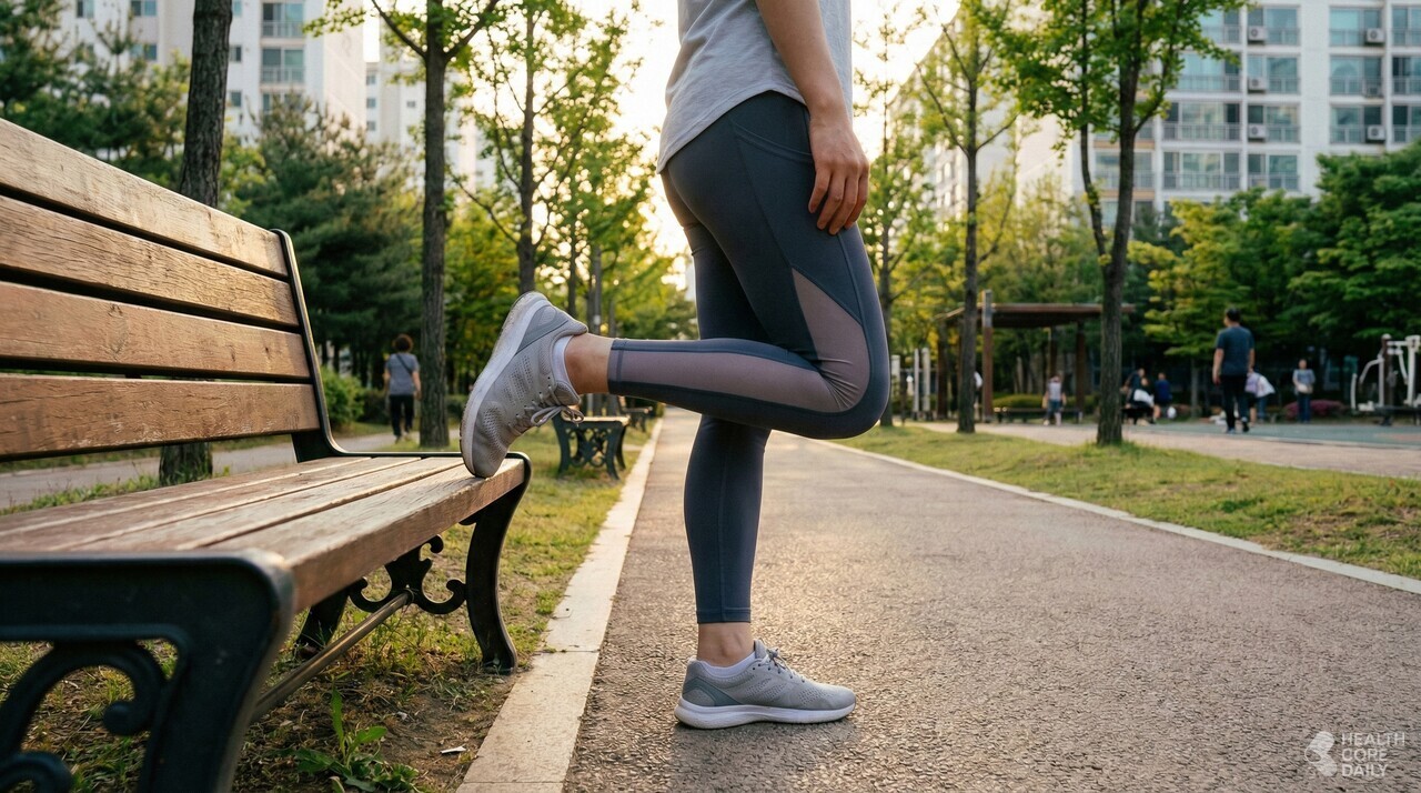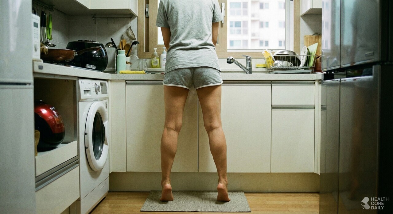 계단이 없으면 맨바닥에서 까치발을 서도 되고, 책이나 상자 위에 발 앞꿈치를 올리고 하면 더 넓은 가동 범위를 쓸 수 있다. 까치발 20회 3세트를 꾸준히 하면 종아리 근육인 비복근이 단련되어 정맥 펌프 기능이 강화된다. 이 운동이 주목받는 이유는 설거지, 요리처럼 주방에 서 있는 시간에 별도의 준비 없이 바로 끼워 넣을 수 있기 때문이다. 운동을 시작하기 전 수건으로 발 끝을 감싸 당겨주는 스트레칭을 15~30초씩 3세트 해주면 근육 부상을 예방할 수 있다.