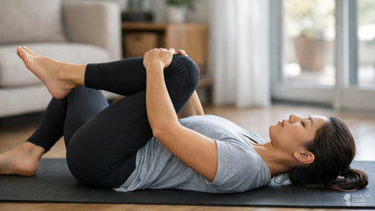 첫 번째 동작은 누운 자세에서 다리를 교차해 당기는 방법이다. 매트에 등을 대고 누운 뒤 오른쪽 다리는 바닥에 편 채로 두고, 왼쪽 다리를 들어 오른쪽 다리 위에 얹는다. 그 상태에서 두 다리 사이로 양손을 넣어 오른쪽 허벅지 뒤를 잡고 천천히 가슴 쪽으로 당긴다.