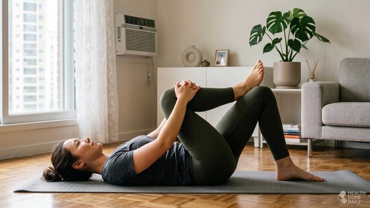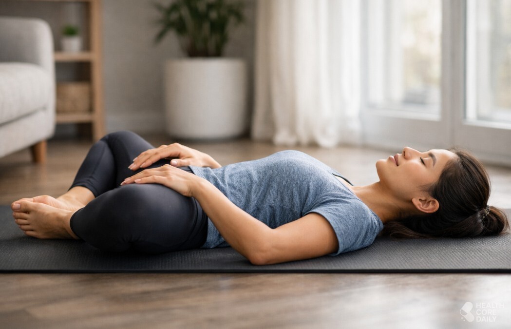 엉덩이 깊은 부위와 허벅지 뒤쪽이 늘어나는 느낌이 들면 제대로 된 것이다. 충분히 유지한 뒤 다리를 바꿔 동일하게 반복한다. 이 동작은 고관절 주변의 깊은 근육을 직접 이완시키기 때문에 골반 압박감을 줄이고 허리 부담을 낮추는 데 도움이 된다.