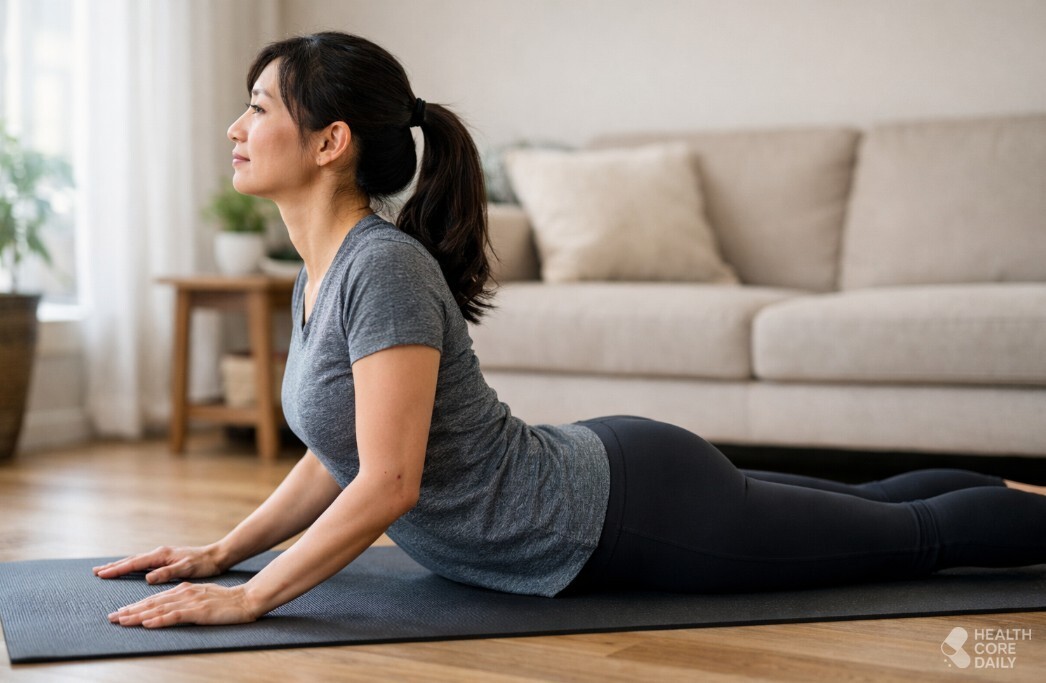 세 번째는 엎드린 자세에서 상체를 들어 올리는 동작이다. 매트 위에 엎드려 손을 가슴 옆 바닥에 두고, 팔로 바닥을 밀면서 상체를 서서히 들어 올린다. 가슴이 열리는 느낌과 함께 복부 앞쪽과 어깨 아래쪽이 늘어나면 된다.