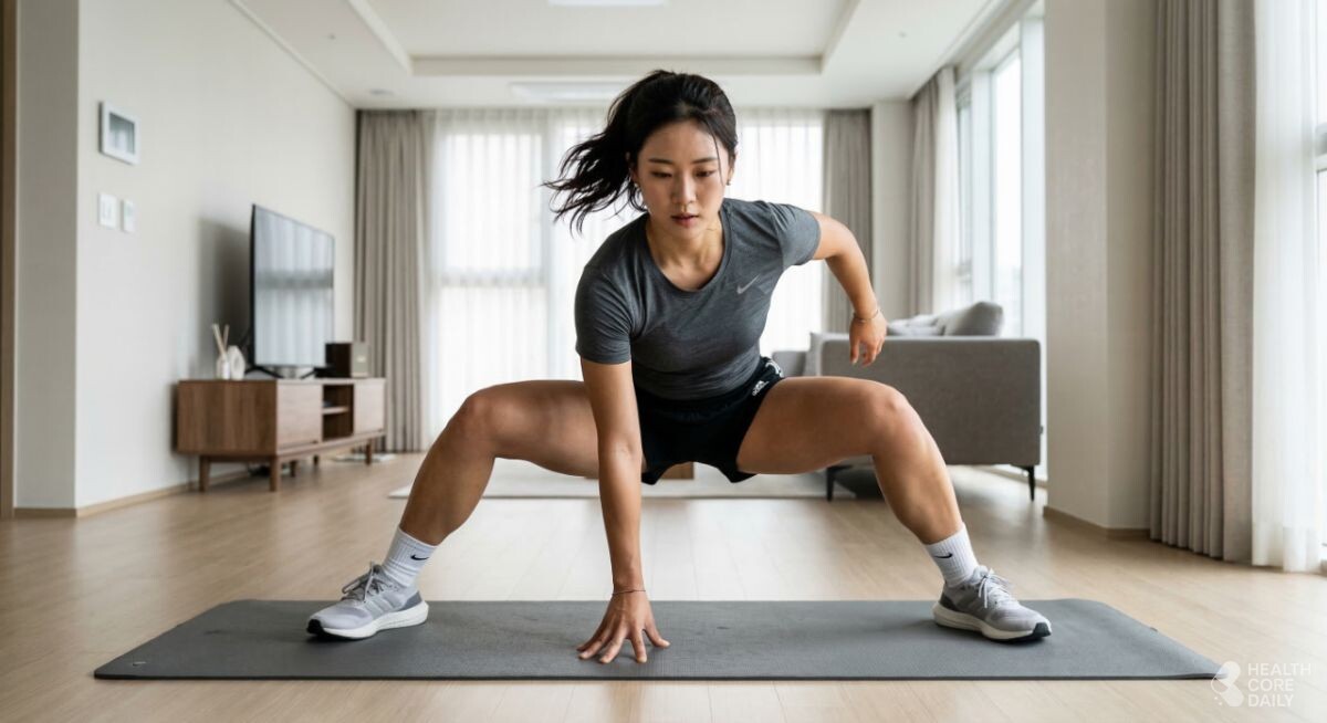 집에서 운동을 진행할 때는 매트를 깔고 공간을 확보한 뒤, 한 동작씩 반복하며 진행하는 것이 좋다. 같은 동작을 일정 횟수 반복한 뒤 다음 동작으로 넘어가면 복부, 하체, 상체를 고르게 사용할 수 있다.