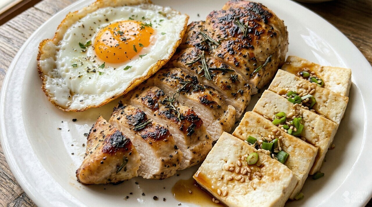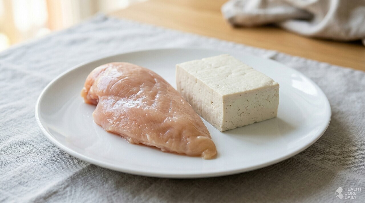 근력 운동을 병행하면서 체형을 유지하거나 근육을 키우고 싶다면 1.6~2.2g/kg이 적합하다. 체중 60kg이면 하루 96~132g, 체중 80kg이면 128~176g이다. 수치로만 보면 막막하게 느껴지지만, 달걀 2개(약 12g), 닭가슴살 150g(약 35g), 두부 반 모(약 20g), 그릭요거트 한 컵(약 15g)을 하루에 챙기면 80g을 넘길 수 있다. 여기에 식사 중 자연스럽게 섭취하는 단백질을 합치면 목표치에 가까워진다.