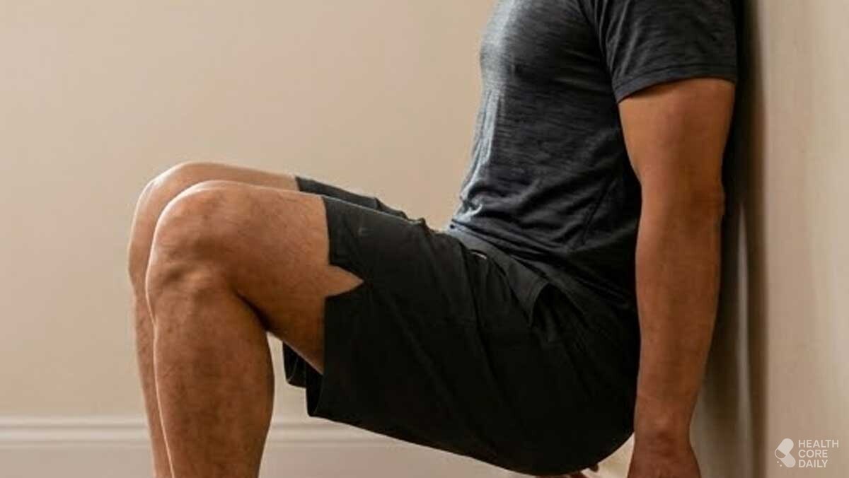 이 동작의 가장 큰 특징은 벽이 등을 받쳐주기 때문에 척추가 흔들리지 않는 상태에서 다리 힘만 집중적으로 쓸 수 있다는 점이다. 무릎이 발끝보다 지나치게 앞으로 나가는 것을 벽이 자연스럽게 막아주기 때문에, 무릎 관절에 가해지는 부담이 줄어든다.
