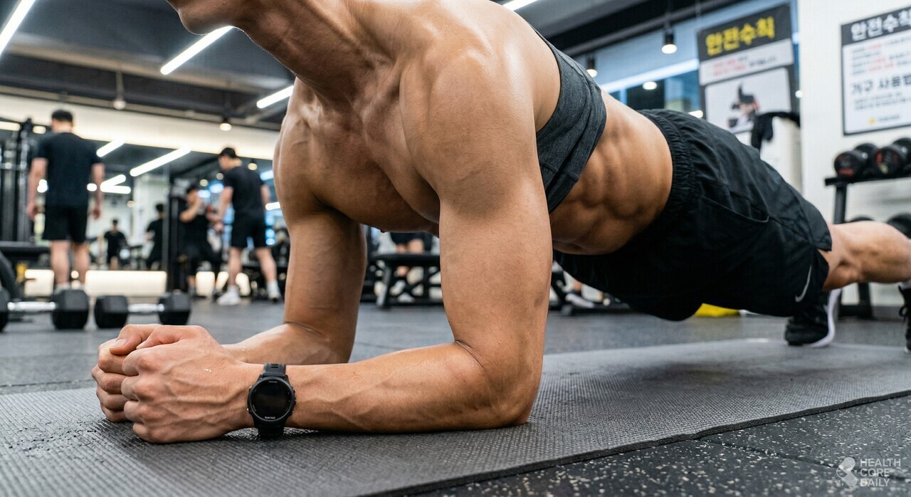 플랭크는 코어 전체를 등척성으로 수축시키는 동작으로 허리 부담이 낮아 초보자나 재활 단계에서도 활용된다. 30초씩 3세트를 기준으로 시작해 버티는 시간을 점진적으로 늘려가는 방식이 일반적이다.