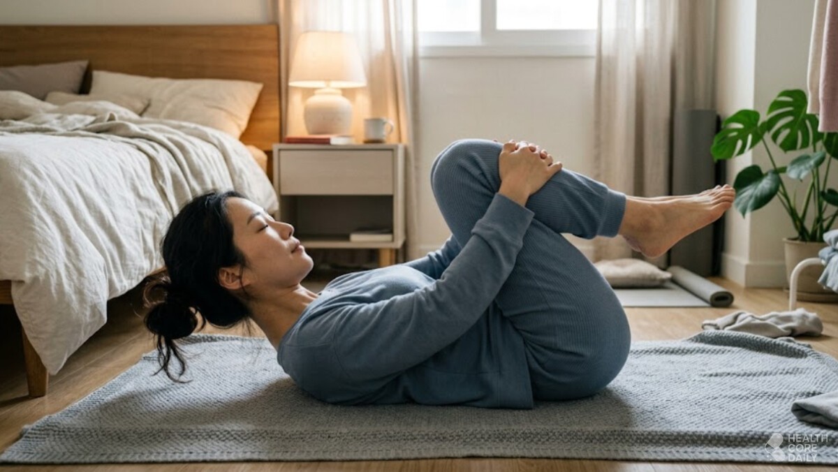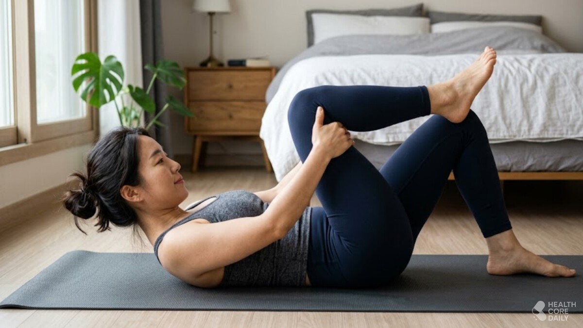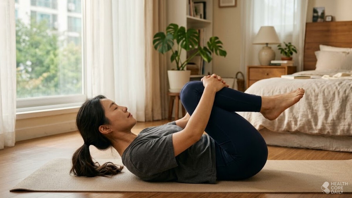 - 양 무릎 당기기: 무릎 감싸 안고 가슴 쪽으로 지그시 당기기 (20초 유지)