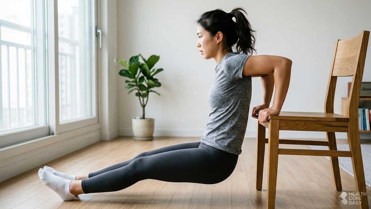세 가지 동작 중 팔뚝 뒷면에 가장 강하게 자극이 가는 동작이 체어 딥스다. 의자나 침대 모서리를 이용하면 되는데, 방법 자체는 단순하다. 의자를 등 뒤에 두고 양손으로 모서리를 짚은 뒤 다리를 앞으로 뻗는다. 그 상태에서 엉덩이를 공중에 띄운 채 팔꿈치가 90도가 될 때까지 몸을 천천히 내렸다가, 팔 뒤쪽에 힘을 줘서 다시 밀어 올리면 된다.