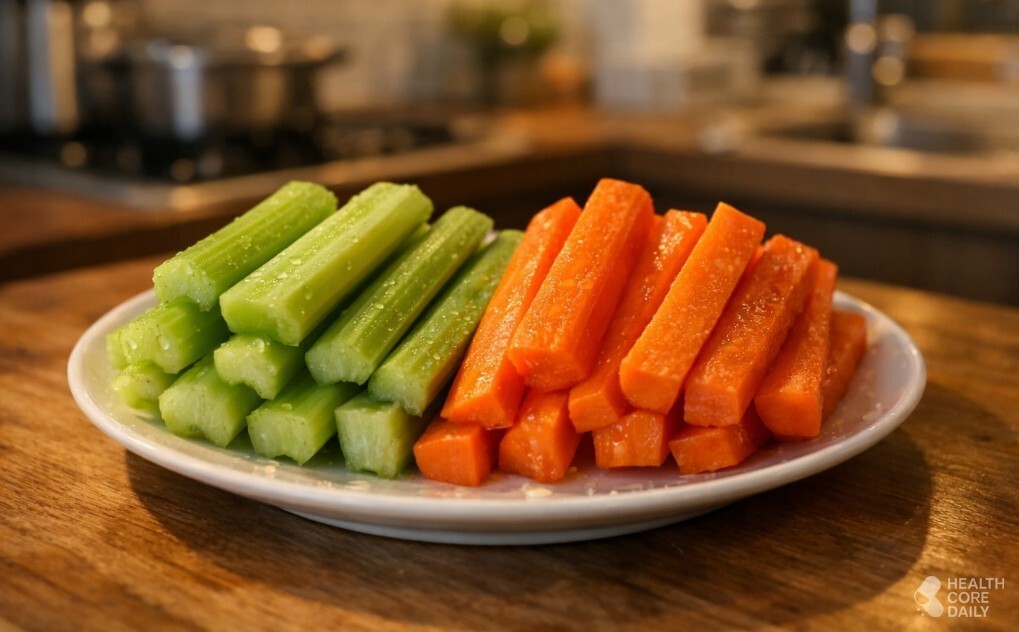 당근 역시 스틱 형태로 자주 먹는 채소다. 베타카로틴 성분이 들어 있으며 씹는 식감이 분명하다. 당근 100g의 열량은 약 34kcal 수준이다. 칼로리가 높지 않아 간단한 간식으로 선택하는 경우가 많다.