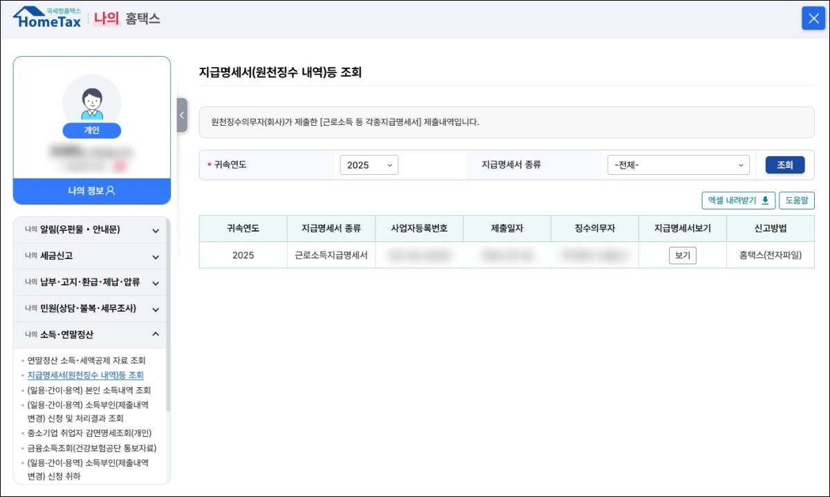 그 외에는 홈택스 홈페이지 → 로그인 → 나의 홈택스 → 소득/연말정산 → 지급명세서 조회 → 근로소득지급명세서 메뉴에서 관련 정보를 확인할 수 있다. 다만 국세청 홈택스에서의 환급금 정보는 5월 이후에 최종 등록되므로, 당장 확인이 필요한 경우에는 급여명세서를 확인하는 것이 더 현실적이다.