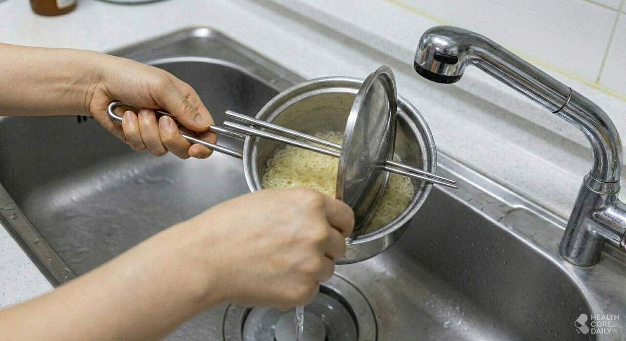 이럴 땐 젓가락 하나면 충분하다. 냄비 위에 젓가락을 가로로 걸치고 그 위에 뚜껑을 덮은 뒤 살짝 눌러 기울이면, 물만 빠지고 면은 그대로 남는다. 젓가락이 물길을 막아주고 뚜껑이 면을 눌러주는 구조다.