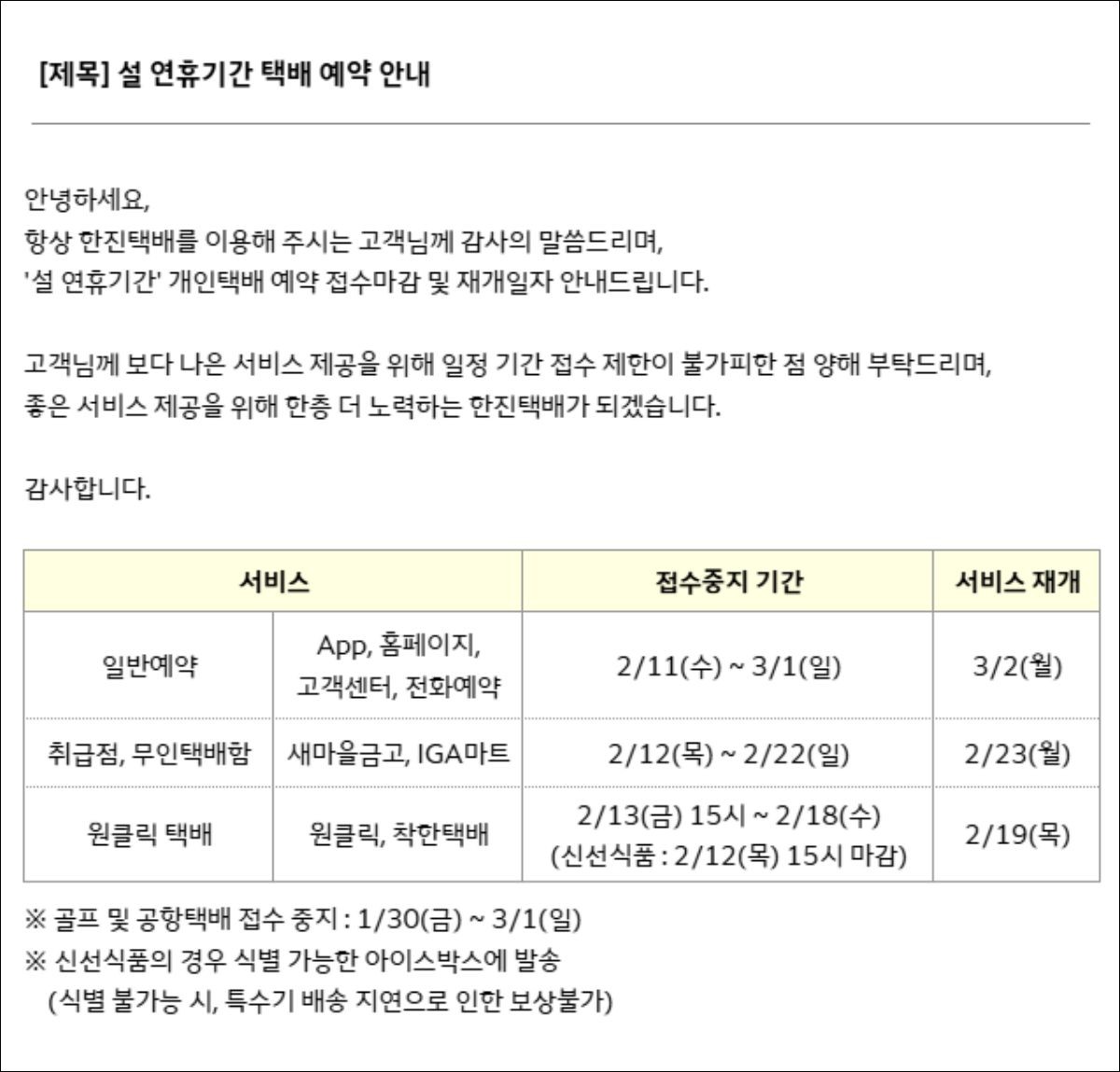 한진택배는 접수 방식에 따라 제한 시점이 다르다. 앱, 홈페이지, 고객센터를 통한 일반 예약은 2월 11일부터 3월 1일까지 중단된다. 취급점과 무인택배함 접수는 2월 12일부터 2월 22일까지 제한되고, 원클릭 택배는 2월 13일 오후 3시부터 2월 18일까지 접수가 멈춘다. 또한 신선식품은 2월 12일 오후 3시에 접수가 먼저 마감된다.