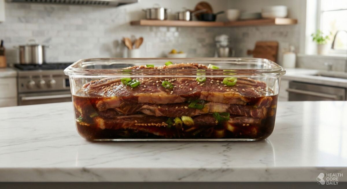 이제 고기를 넓은 용기에 한 줄씩 펼치고, 그 위에 양념을 국자로 고루 끼얹는다. 층을 쌓을 때마다 양념을 반복한다. 최소 3시간 냉장 숙성하고, 여유가 있다면 8시간 둔다. 숙성 시간이 길수록 간이 깊어진다.