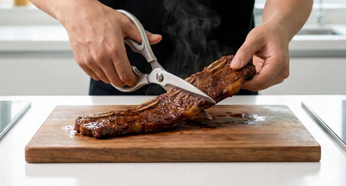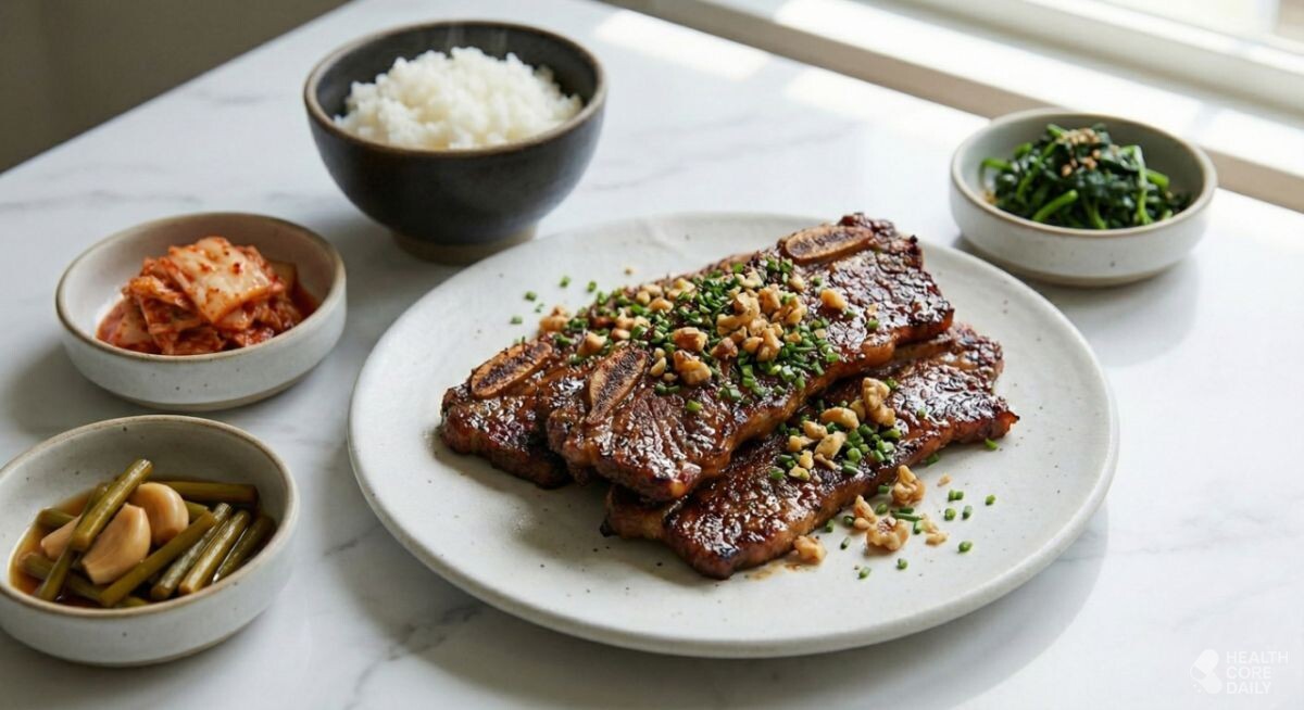 너무 오래 두면 수분이 빠진다. 가위로 먹기 좋게 자르고, 팬에 남은 양념을 끼얹어 조리듯 마무리하면 완성이다. 완성된 갈비는 접시에 차곡히 담는다. 견과를 굵게 다져 올리거나 송송 썬 쪽파를 얹어 흰쌀밥과 곁들이면 간이 어우러진다.