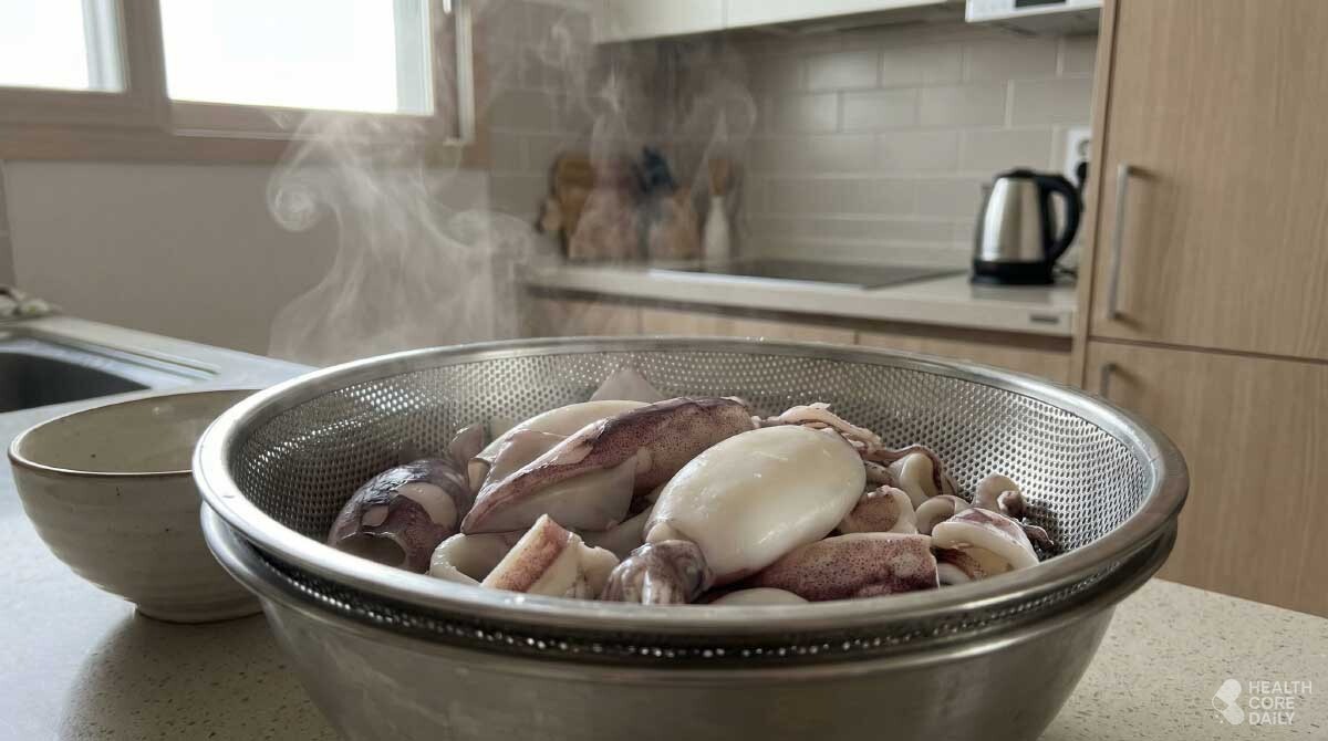 많은 사람이 오징어를 데칠 때 물만 끓여서 그대로 넣는 방식으로 시작한다. 하지만 이 방법은 식감뿐 아니라 냄새나 소화 흡수 측면에서도 단점이 많다. 조리 과정 중 오징어 단백질이 갑자기 수축하거나 비린내가 제대로 빠지지 않아 식탁에 올렸을 때 만족도가 떨어지는 경우가 흔하다.