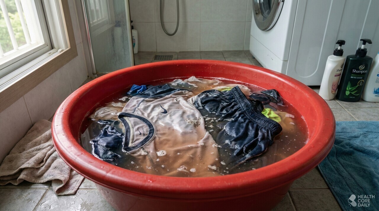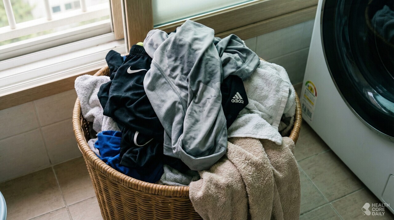 따뜻하고 축축한 환경에서 세균이 폭발적으로 늘기 때문에, 세탁 전이라도 먼저 펼쳐서 말려두는 게 낫다. 하루 이상 방치할수록 냄새 분자가 섬유 깊숙이 파고들어 나중엔 어떤 방법으로도 제거가 어려워진다. 이 모든 방법을 써도 냄새가 사라지지 않는다면 섬유 자체가 이미 변성된 것일 수 있다. 폴리에스터 운동복이나 수건은 일정 기간 사용 후 교체하는 게 현실적인 선택이다.