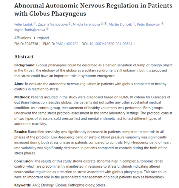 (Globus Pharyngeus(인후이물감)에 대한 논문 : 이 논문에서 인후 이물감 환자들이 스트레스 상황에서 정상인보다 자율신경 조절 반응이 비정상적으로 나타난다는 것을 보여주며 이는 이물감이 단순한 목의 문제가 아니라 스트레스에 대한 신경계 반응 이상과 관련된 기능적 질환일 가능성을 시사합니다.)