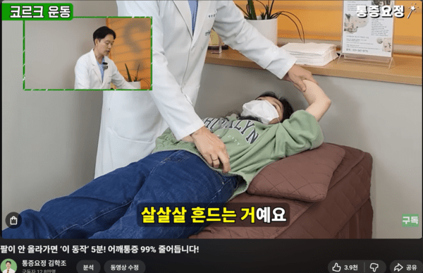 (출처 : 유튜브 채널 통증 요정 - 통증 요정 김학조가 만든 최고의 오십견 운동 코르크 운동입니다. 우리 몸이 작동하는 원리가 있습니다. 내 몸의 소리를 듣고 그 원리대로 움직여보세요. 어깨의 움직임에 반드시 변화가 생깁니다.)