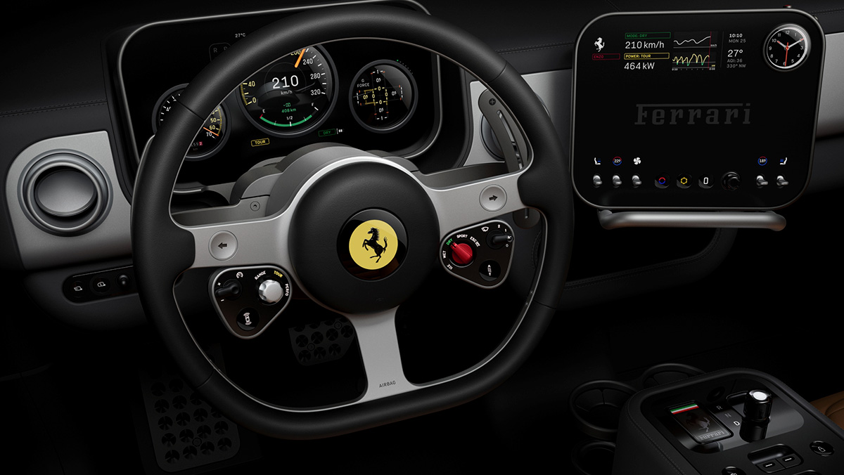 실내 디자인은 ‘휴먼 인터페이스’를 핵심 가치로 내세웠다 . 페라리와 러브프롬은 ‘전기차는 대형 터치스크린이 주도한다’는 업계의 고정관념을 깨고, 다수의 제어 장치를 기계식 버튼과 다이얼로 구현해 사용자가 직접 조작하는 직관적인 경험을 강조했다 .