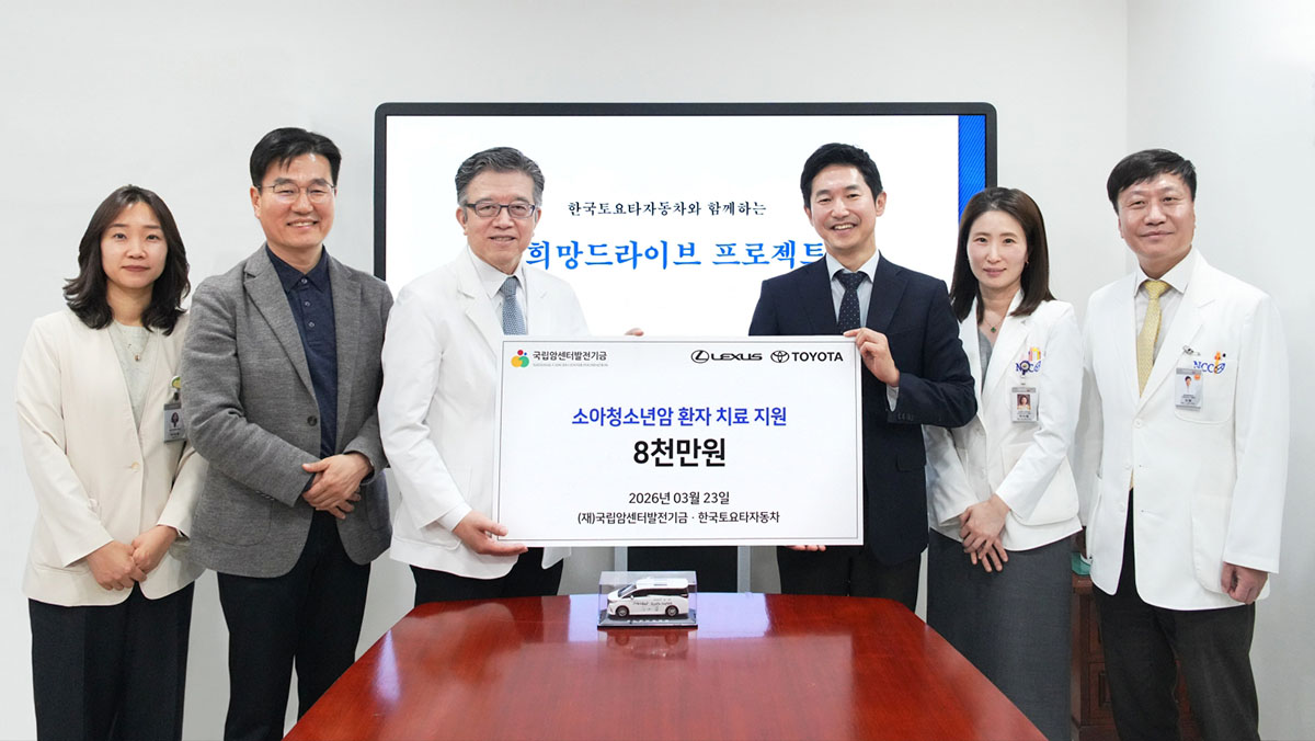 한국토요타자동차가 소아·청소년 및 취약계층 암 환자 치료 지원을 위해 지난 23일 국립암센터에 기부금 8000만 원을 전달했다고 밝혔다. 이번 전달식에는 이병진 한국토요타자동차 부사장과 양한광 국립암센터 원장 등이 참석했으며, 행사 후 소아·청소년암 환아 병동 방문이 진행됐다.