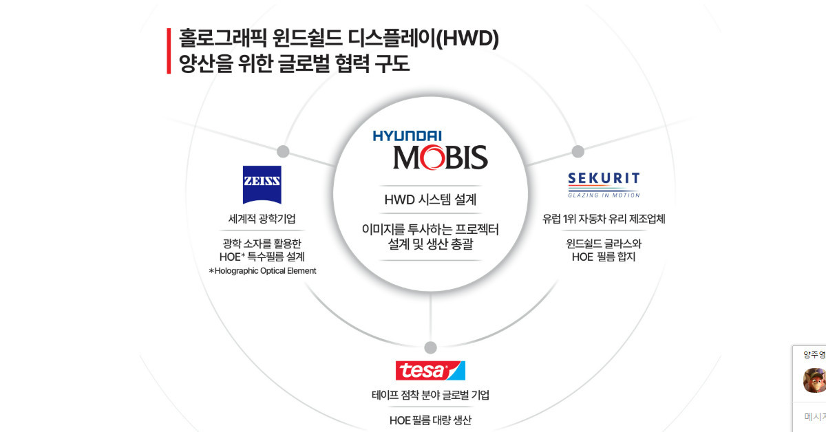 역할 분담은 철저하다. 현대모비스는 전체 시스템을 총괄하며 이미지를 쏘아 올리는 프로젝터를 설계하고 생산한다. 자이스는 초정밀 광학 기술을 바탕으로 HOE 필름을 설계해 화면의 선명도를 책임진다. 이렇게 설계된 고기능 필름은 테사가 넘겨받아 대량 생산 체제를 구축하고, 마지막으로 세큐리트가 이 필름을 자동차 앞 유리에 완벽하게 밀착 결합하는 정밀 공정을 수행한다.