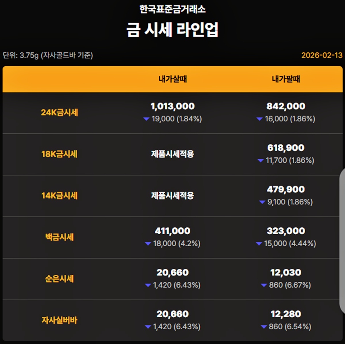 국내 금시세(금값)가 13일(이하 한국 시각) 오후 하락세(전 거래일 대비)로 마감했다.