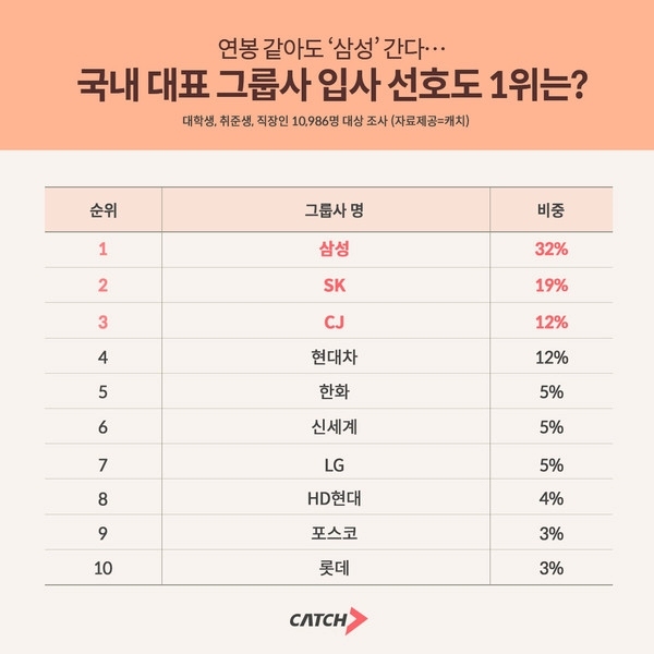 20일 채용 플랫폼 진학사 캐치가 대학생·구직자·직장인 1만 986명을 대상으로 '연봉이 동일할 경우 근무하고 싶은 그룹사'를 조사한 결과를 발표했다. 입사 선호 그룹사 1위는 '삼성'(32%)이었다.