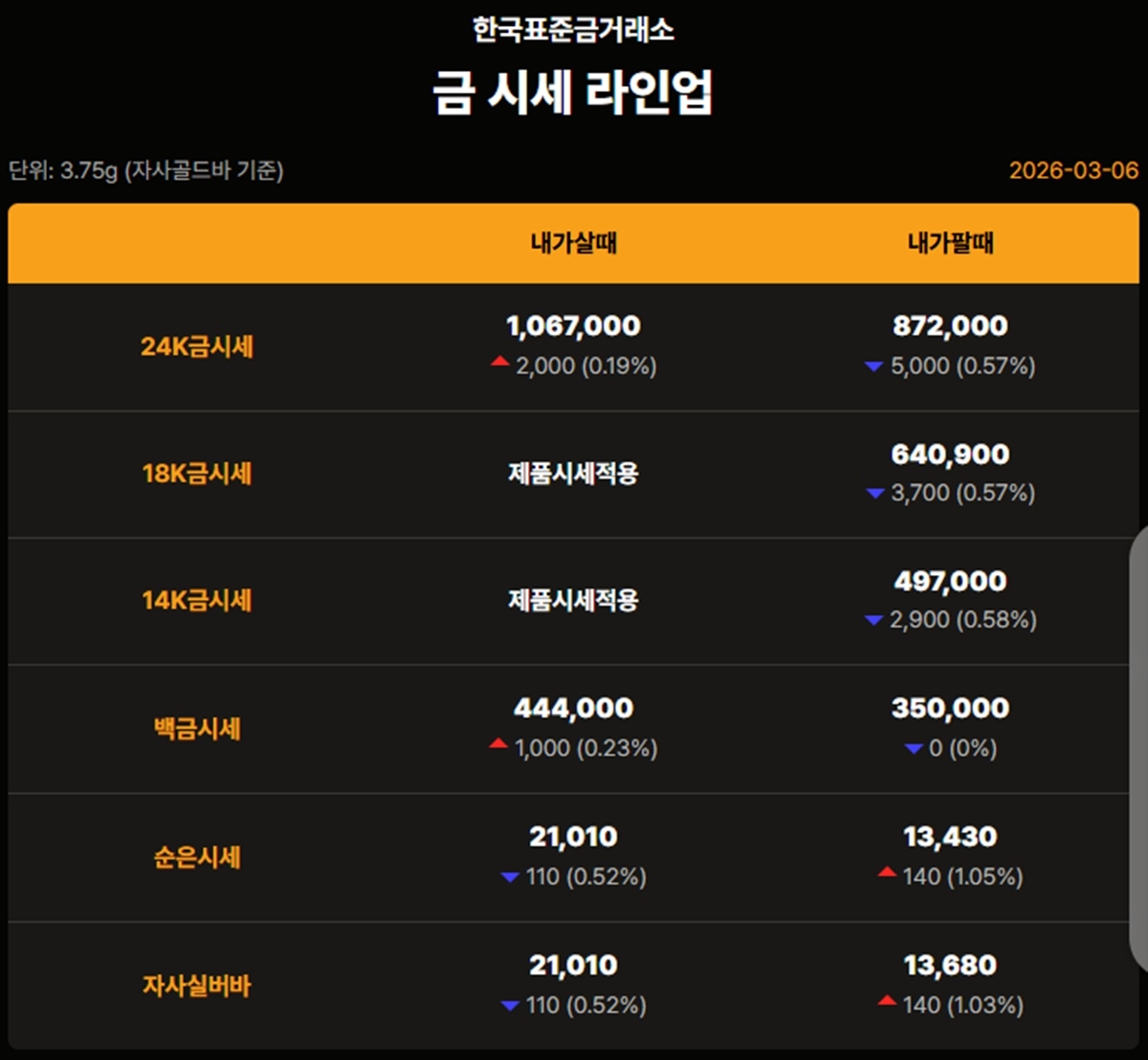 순금 : 매입가 106만 7000원 / 매도가 87만 2000원