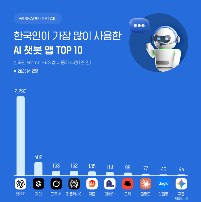 2026년 2월 기준 한국인 스마트폰 사용자가 가장 많이 이용한 AI 챗봇 앱은 챗GPT로 월간 활성 사용자 수(MAU) 2293만 명을 기록했다. 이는 국내 전체 사용자 규모 면에서 압도적인 1위 수치다. 뒤를 이어 제타가 402만 명으로 2위에 올랐으며 일론 머스크의 그록 AI가 153만 명으로 3위를 차지했다. 퍼플렉시티는 152만 명, 뤼튼 135만 명, 에이닷 119만 명 순으로 집계됐다. 크랙(98만 명), 클로드(77만 명), 다글로(46만 명), 구글 제미나이(44만 명) 등이 상위 10위권에 이름을 올렸다. 이번 조사에서 챗GPT를 비롯해 제타, 그록 AI, 크랙, 클로드는 각각 역대 최대 사용자 수를 경신하며 AI 챗봇 시장의 가파른 성장세를 증명했다.