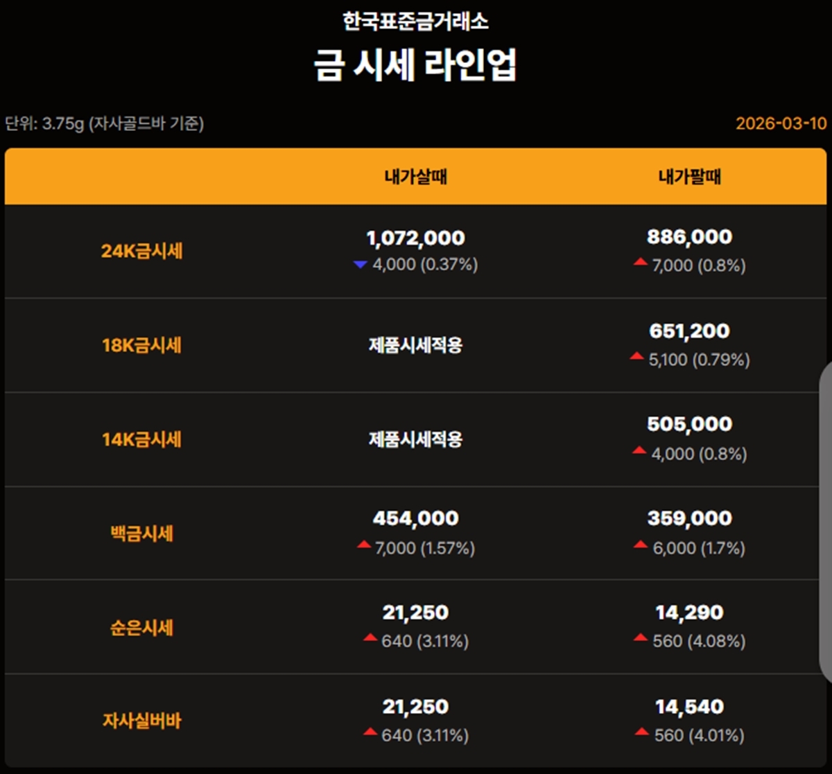 국내 금시세(금값)가 10일(한국 시각) 오후 상승세(전 거래일 대비)를 보이고 있다.