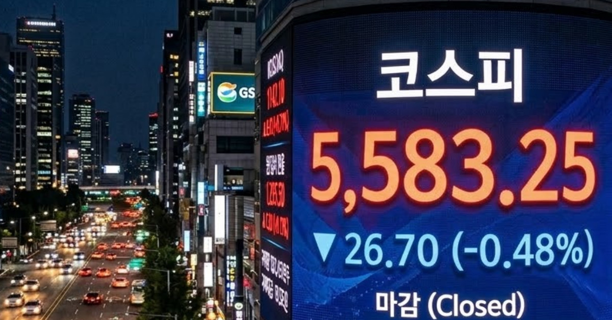 코스피 지수가 외국인과 기관의 동반 매도세에 밀려 5583.25으로 하락 마감했다.