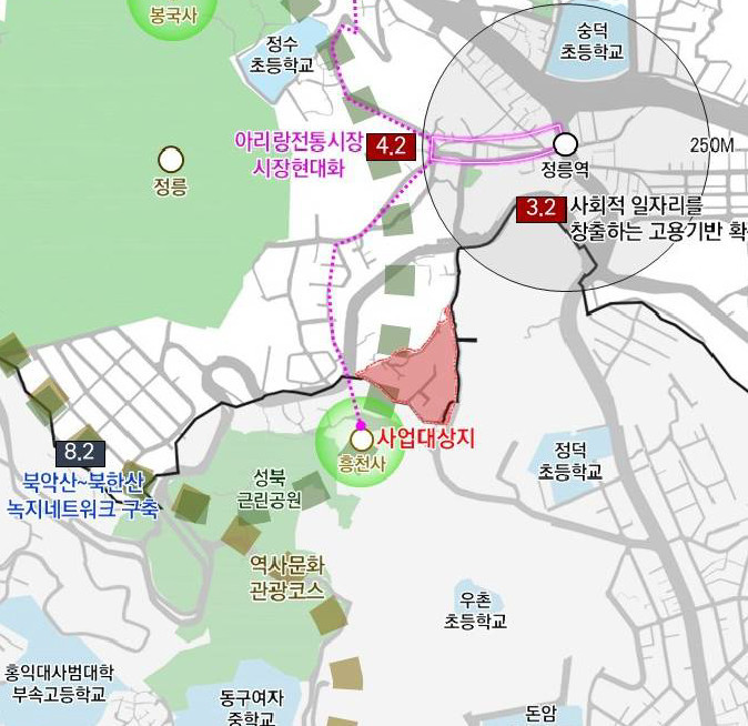 정릉역(우이신설선) 인근의 지리적 특성을 고려해 북측 마을버스 정류장을 사업지 내부로 이전 배치하여 이용객들의 안전과 편의성을 높인다. 주요 도로 폭도 확장하여 아리랑로5길은 8~12m에서 12~15m로, 아리랑로5다길은 4~8m에서 8~12m로 넓어진다. 도로변에는 연도형(건물을 길을 따라 배치하는 방식) 개방형 공동이용시설과 근린생활시설을 조성해 지역 커뮤니티를 활성화할 계획이다. 사업지 주변으로는 봉국사, 흥천사 등 역사 문화 자원과 정수초등학교, 숭덕초등학교 등 교육 시설이 위치해 있다.