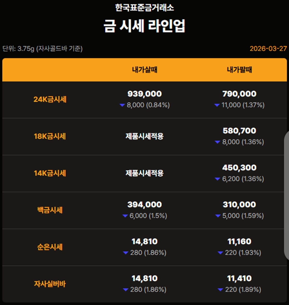 국내 금시세(금값)가 27일(이하 한국 시각) 오후 상승세(전 거래일 대비)를 상승세를 보이고 있다.