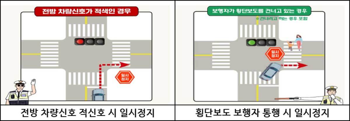 우회전 일시정지 방법을 정확히 알려면 두 이미지에 보이는 정지선 위치를 꼼꼼히 확인해야 한다.